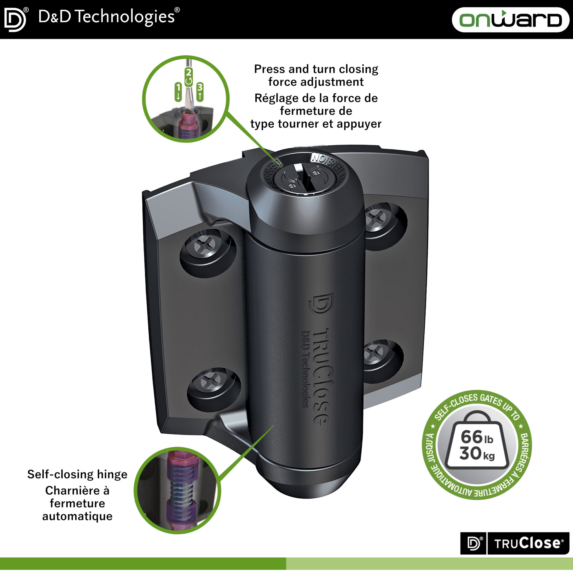 – Fermeture automatique des barrières pesant jusqu’à 66 lb (barrière de 60 po h x 36 po larg.)