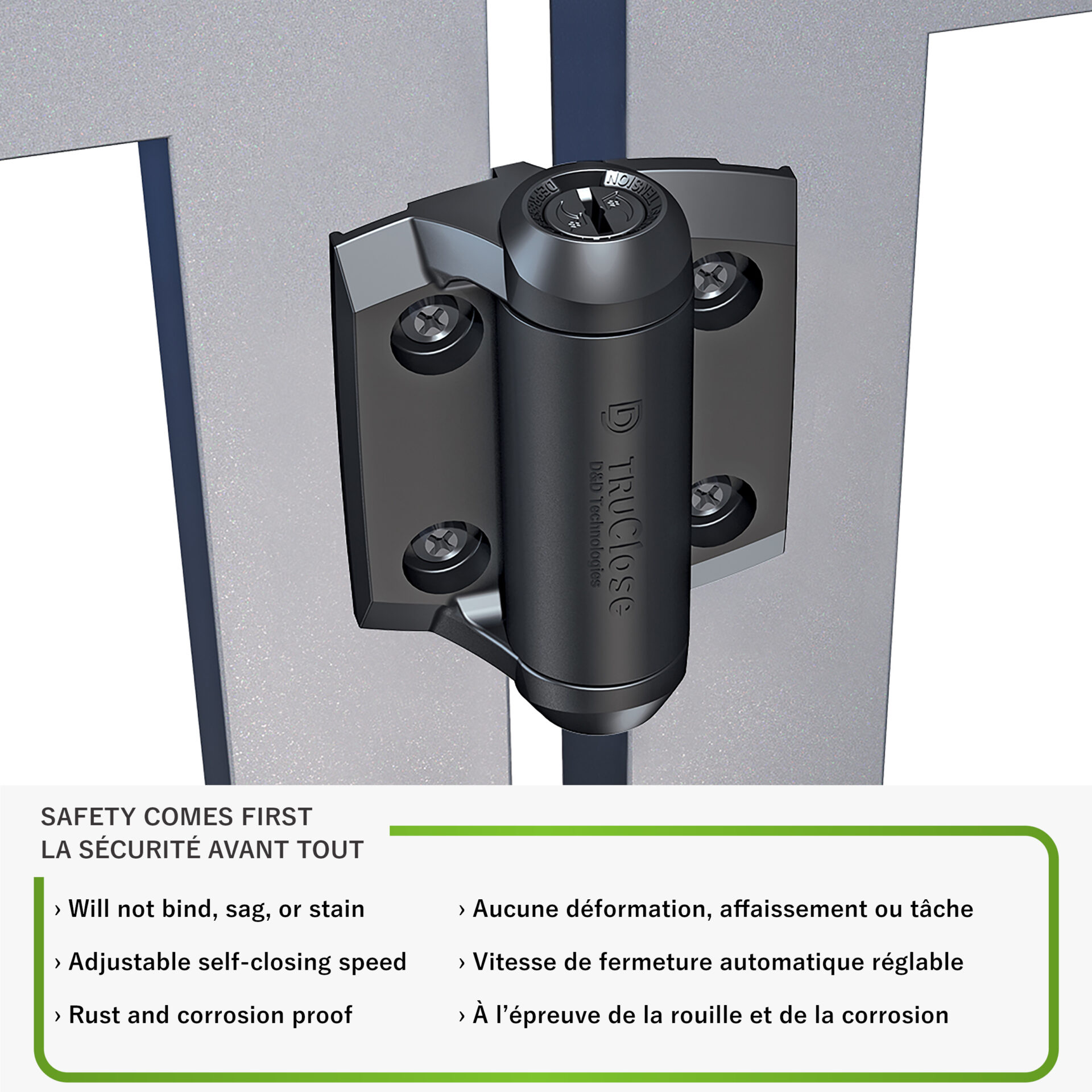 Cette charnière à fermeture automatique réglable convient parfaitement aux barrières de métal. Ces charnières respectent les normes des codes de sécurité pour piscine, et la sécurité de votre espace est à la fine pointe. Ces charnières ne rouillent pas, ne plient pas, ne s’affaissent pas, ne se tâchent pas et elles sont très faciles à installer.